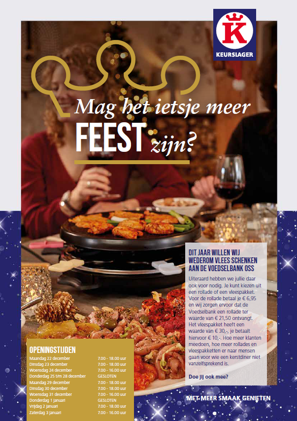 Uiteraard hebben we jullie daar ook voor nodig. Je kunt kiezen uit een rollade of een vleespakket. Voor de rollade betaal je € 6,95 en wij zorgen ervoor dat de Voedselbank een rollade ter waarde van € 21,50 ontvangt. Het vleespakket heeft een waarde van € 30,- je betaalt hiervoor € 10,-. Hoe meer klanten mee doen, hoe meer rollades en vleespakketten er naar mensen gaan voor wie een kerstdiner niet vanzelfsprekend is. Doe jij ook mee?